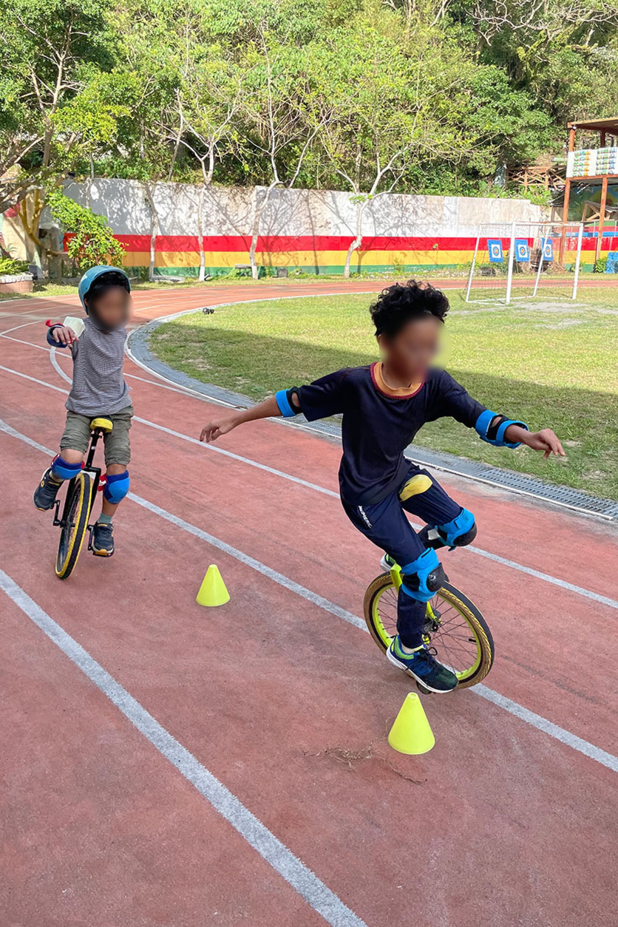 「上車保持平衡、轉彎幅度小點······」,下午明媚的陽光洒在山腰旁的操場上,伴隨著教練鏗鏘有力的指導聲,孩子們彷彿人體天秤般在跑道穿梭,其中一個活潑的身影就是阿豪。