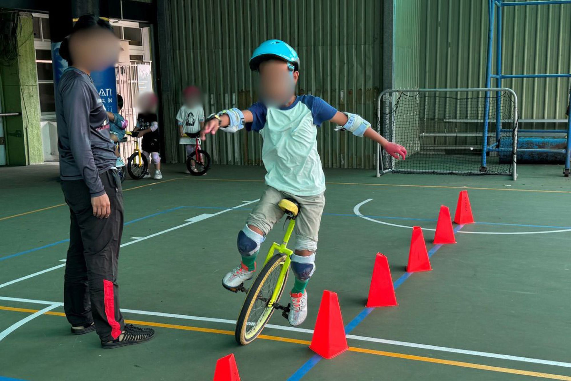 「上車保持平衡、轉彎幅度小點······」,下午明媚的陽光洒在山腰旁的操場上,伴隨著教練鏗鏘有力的指導聲,孩子們彷彿人體天秤般在跑道穿梭,其中一個活潑的身影就是阿豪。他俐落的指導著學弟妹,將自己的經驗傳授給他們:「騎獨輪車一開始會怕摔倒,會騎了之後就不怕摔了,敢摔才會進步啦!」