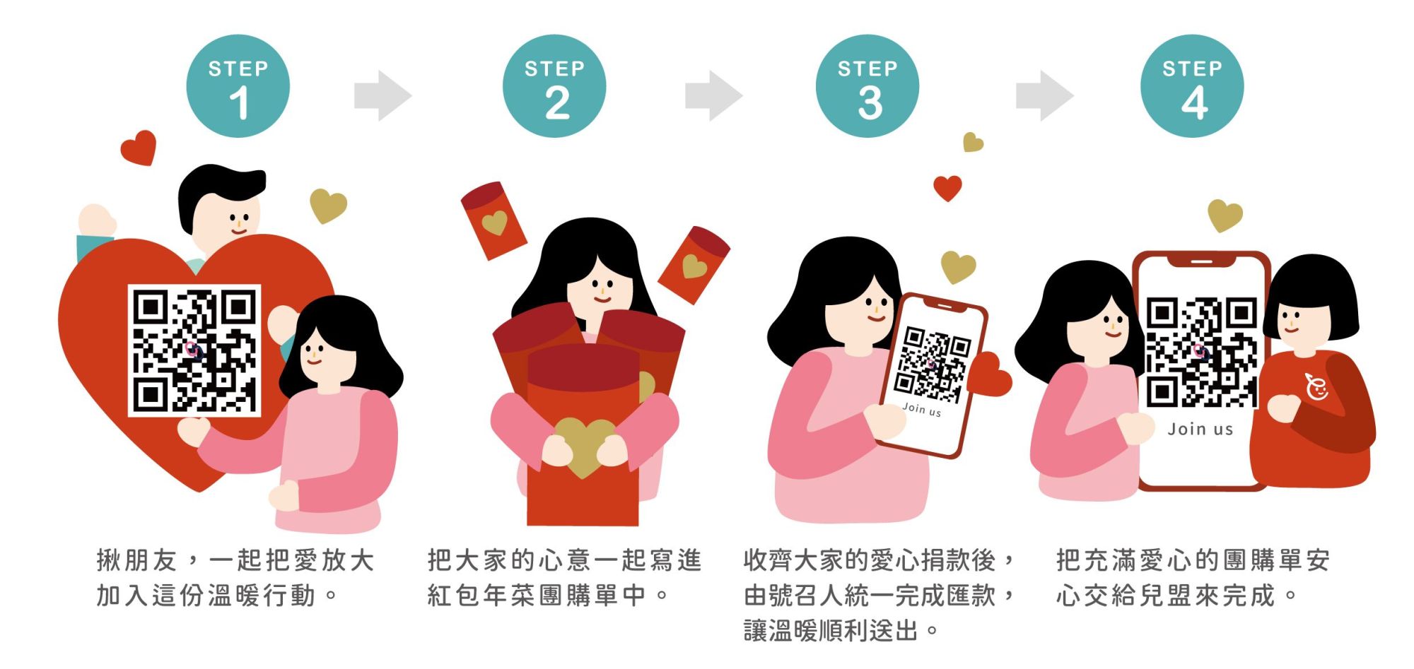 不只是團購年菜,更是「團購愛心」。只要您在群組、公司、社團發起號召,就能讓偏鄉弱勢兒少的過年被愛填滿。